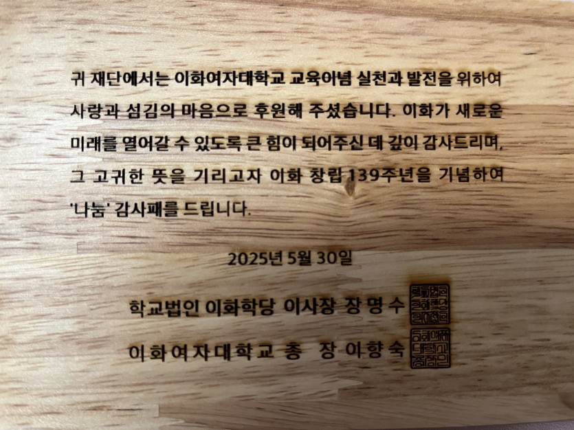 창립 139주년을 맞아 감사패와 인사장을 보내주신 이화여자대학교에 감사를 드립니다.